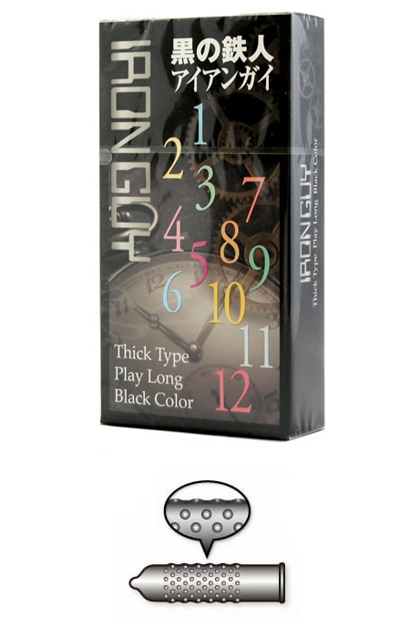 「アイアンガイ」は、多数のつぶ状凸起で脱落防止加工を施した、厚めのコンドームです。 潤滑剤としてウェットゼリータイプが付いています。精悍なブラックカラー。