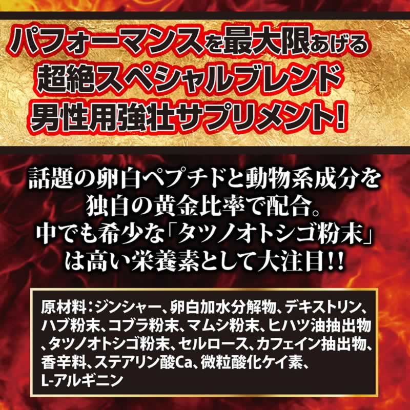 原材料:ジンシャー、卵白加水分解物、デキストリン、ハブ粉末、コブラ粉末、マムシ粉末、ヒハツ油抽出物、タツノオトシゴ粉末、セルロース、カフェイン抽出物、香辛料、ステアリン酸Ca、微粒酸化ケイ素、L-アルギニン