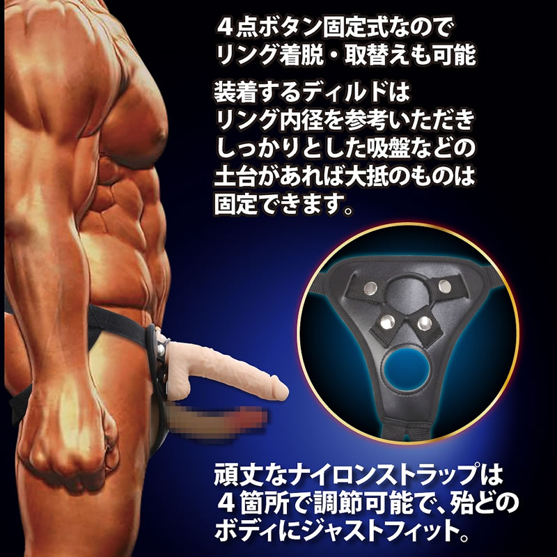 装着するディルドはリング内径をご参考いただき、しっかりとした吸盤などの土台があるディルドであれば大抵のものは固定できます。