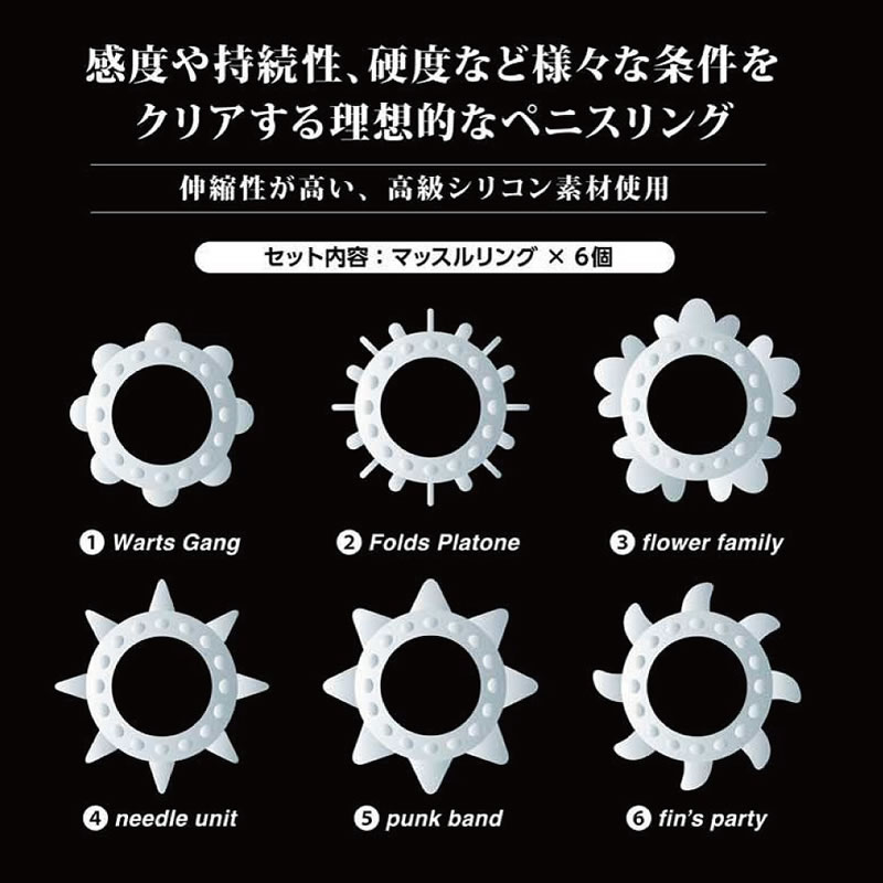 タフで柔軟な個性あふれるシリコンリングの6種セット。
