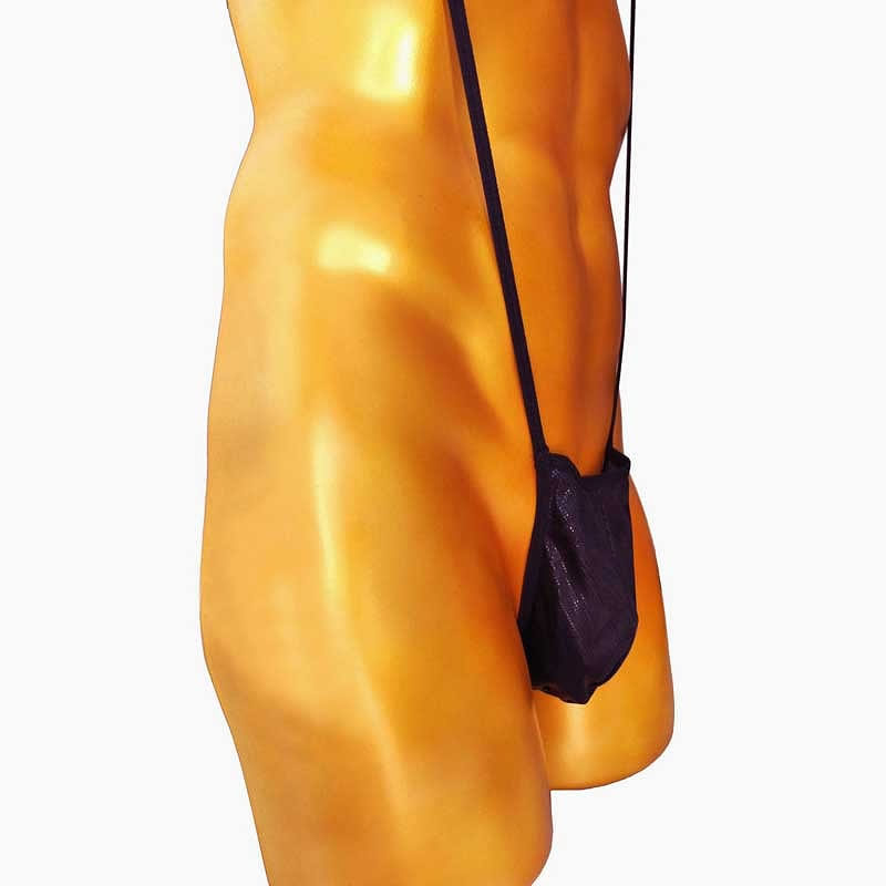 イチモツを小さな網ですくいあげるように吊り下げる、肩掛けストリングショーツ。
