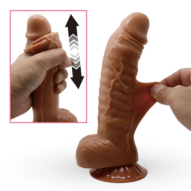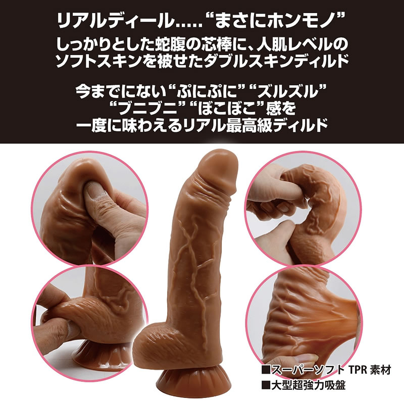 しっかりとした蛇腹の芯棒に人肌レベルのソフトスキンを被せたダブルスキンディルド。