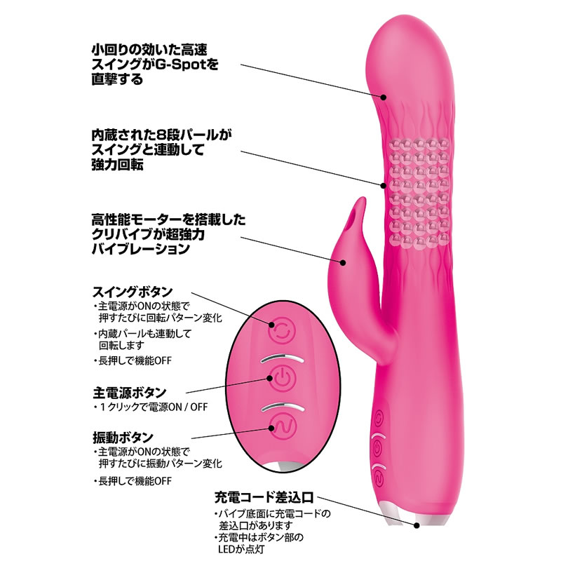 鋭くタイトな先端スイングと、内蔵された8段×6連の回転パールが膣内を心地よくかき回す!
