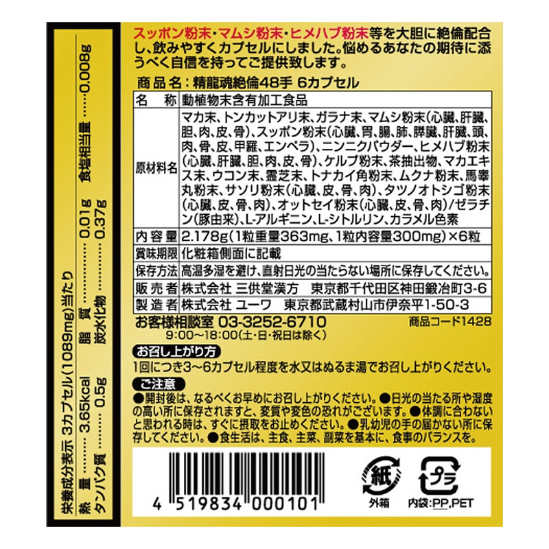 原材料:マカ末、トンカットアリ末、ガラナ末、マムシ粉末(心臓、肝臓、胆、肉、皮、骨)、スッポン粉末(心臓、胃、腸、肺、膵臓、肝臓、頭、肉、骨、皮、甲羅、エンペラ)、ニンニクパウダー、ヒメハブ粉末(心臓、肝臓、胆、肉、皮、骨)、ケルプ粉末、茶抽出物、マカエキス末、ウコン末、霊芝末、トナカイ角粉末、ムクナ粉末、馬睾丸粉末、サソリ粉末(心臓、皮、骨、肉)、タツノオトシゴ粉末(心臓、皮、骨、肉)、オットセイ粉末(心臓、皮、骨、肉)/ゼラチン(豚由来)、L-アルギニン、L-シトルリン、カラメル色素