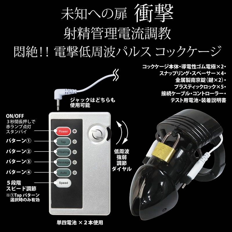 セット内容:コントローラー・コックケージ本体・導電性ゴム電極×2・スナップリング・スペーサー×4・金属製南京錠(鍵×2)・プラスティックロック×5・ケーブル