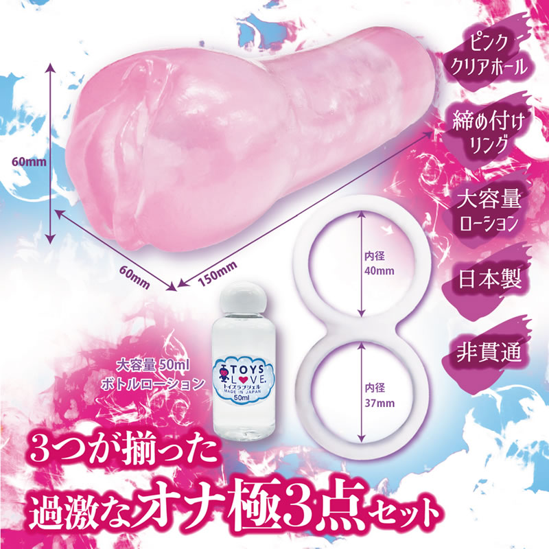 ねっとり絡みつくピンクのクリアホールと感度爆上げの締め付けリング、さらに溢れる愛液のような大量ローションが付属。