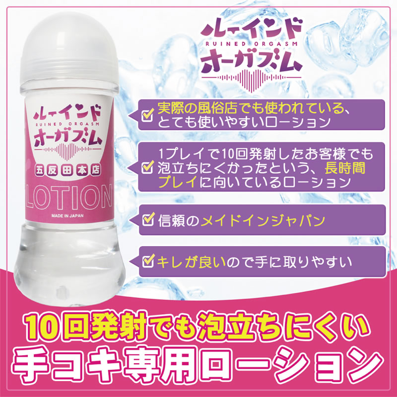 ルーインドオーガズムは何度も発射できる発射方法なのですが、このローションはお店でも使われていて、10回発射でも泡立ちにくい手コキ専用ローションとなります。