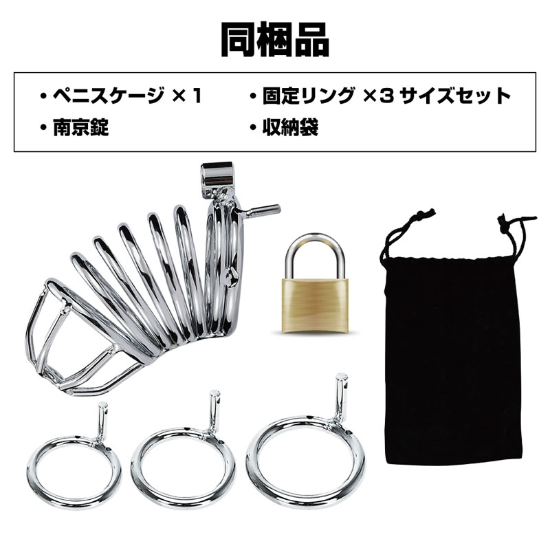 セット内容:ペニスゲージ、固定リング3サイズセット、南京錠、収納袋