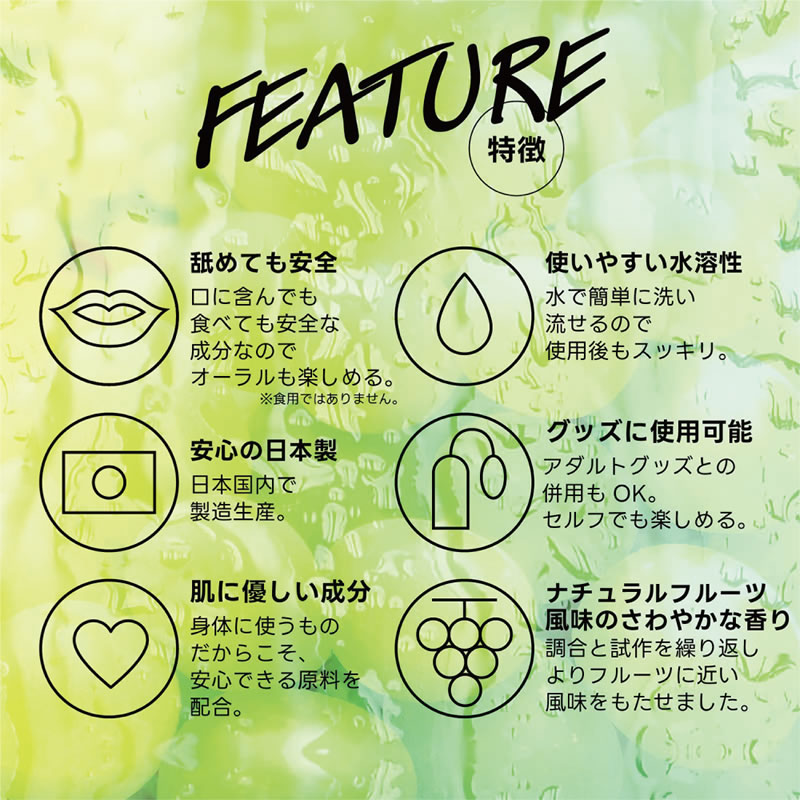 安心安全の国内素材で、水のように「超さらさら」、フルーツみたいに美味しい水溶性ローションです!