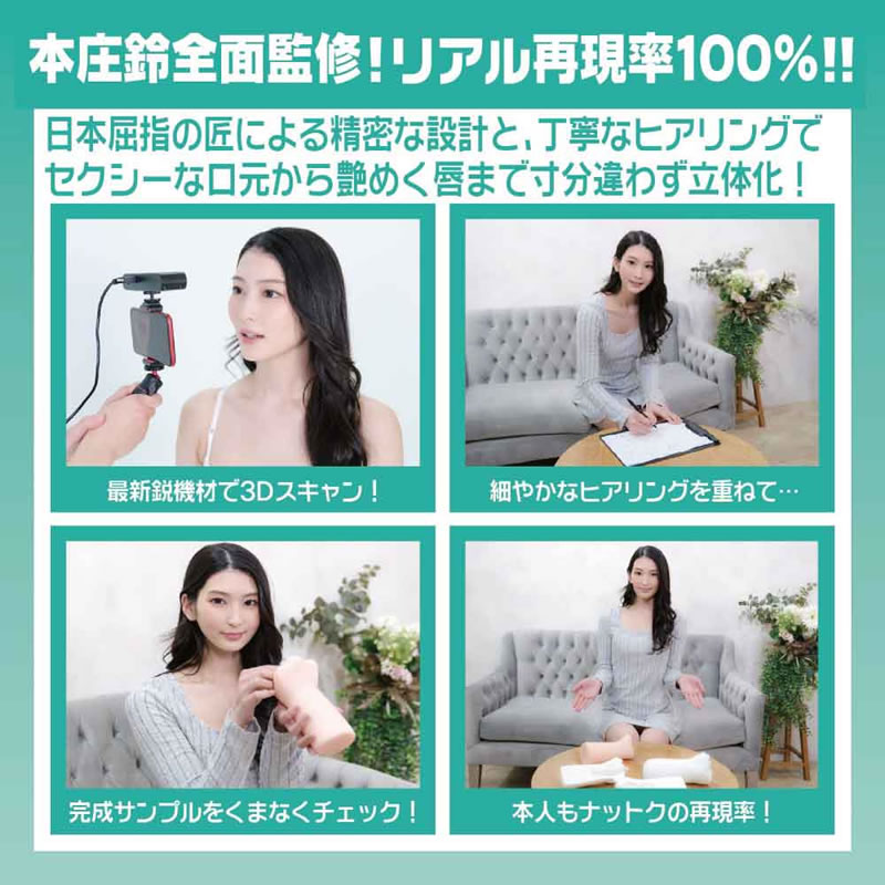 約500gの肉厚密着感と、人工粘膜による2層構造、そして各種の口腔ギミックにより【本庄鈴】のノド強ディープスロート特濃フェラを再現しています。