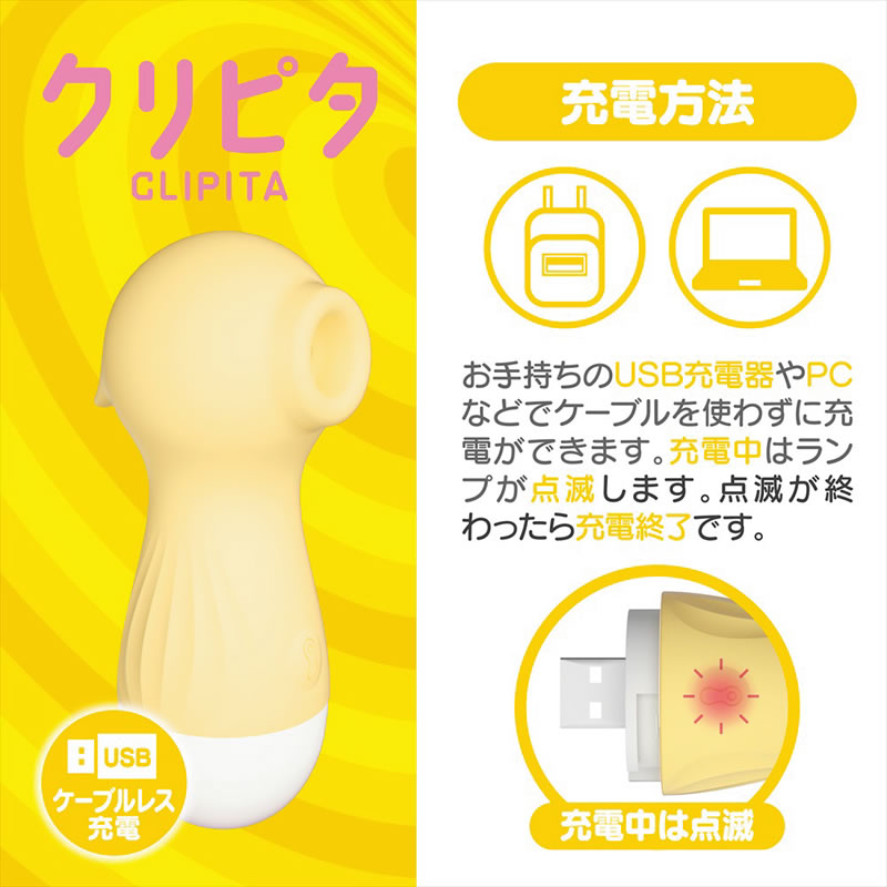吸い付いて震えるクリピタは、シリコン素材で柔らかい触感とケーブルレスで簡単充電が特徴の吸引グッズ。