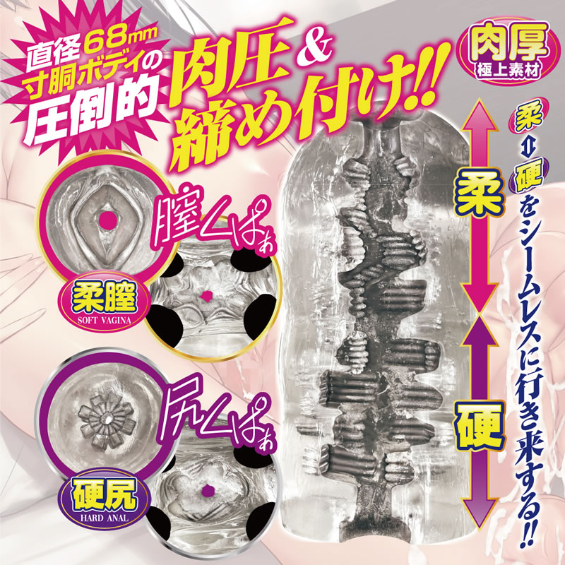 膣側の入口はソフト素材、お尻側の入口はハード素材を使用し、シームレスな硬さの変化を楽しめます。