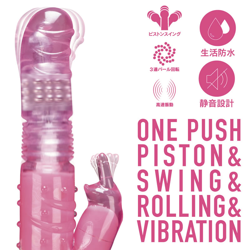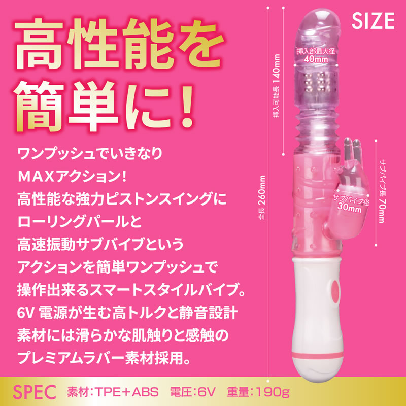 強力ピストンスイング+ローリングパール・高速振動サブバイブという高性能アクションをワンプッシュで操作出来るスマートスタイルバイブです。