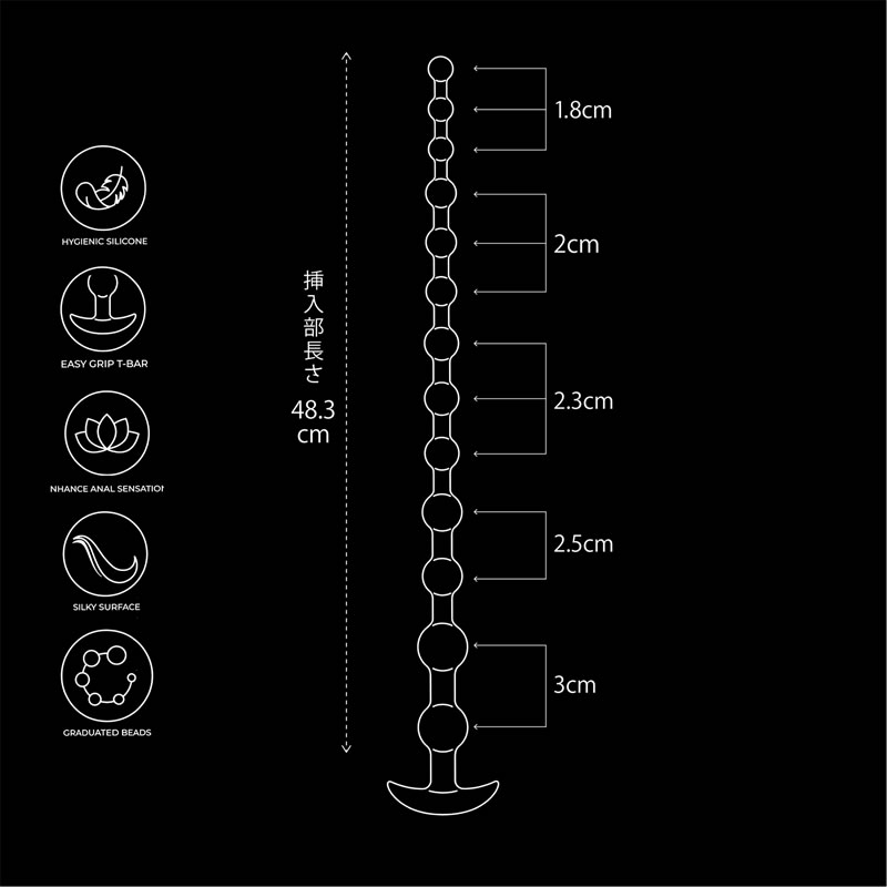 1.8cm×3 → 2cm×3 → 2.3cm×3 → 2.5cm×2 →3cm×2 極小1.8cmから3cmの大玉まで、合計13の快感玉の刺激に震える!! 操作部はロング多玉を操りやすいTハンドルタイプ。 これまでの玉数に物足りなくなったアナルマニアには超オススメです!