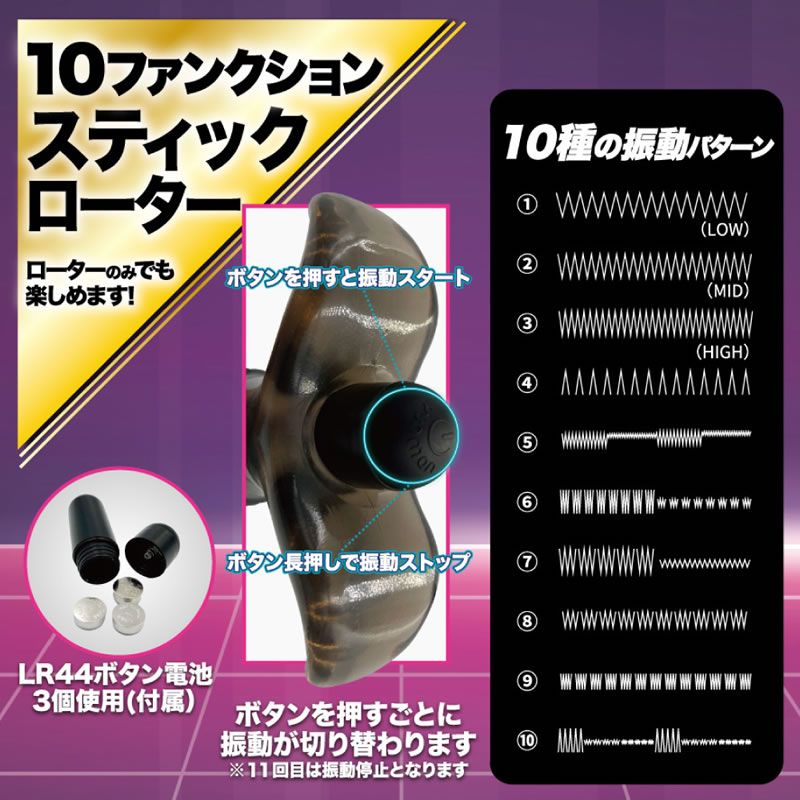 オンオフできるよう取り外し可能なスティックローターで、振動アクション10パターンを搭載。