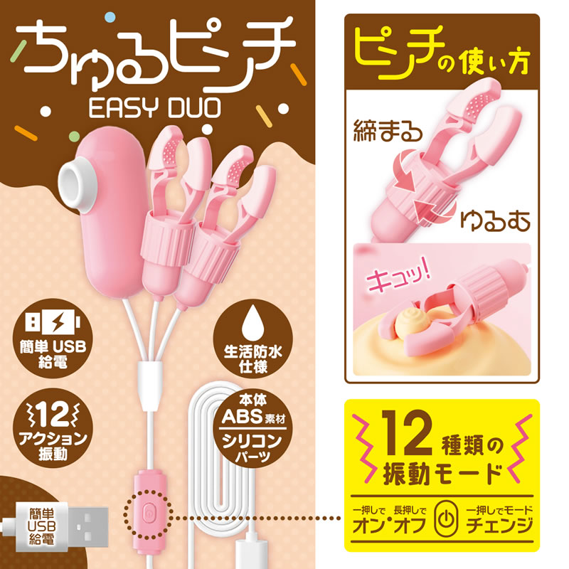 2つのピンチにモーターが搭載されており12モードのアクション振動、吸引部もピンチの先端部分にもシリコンカパーが付いているのでどちらも優しく包みこんでくれます。