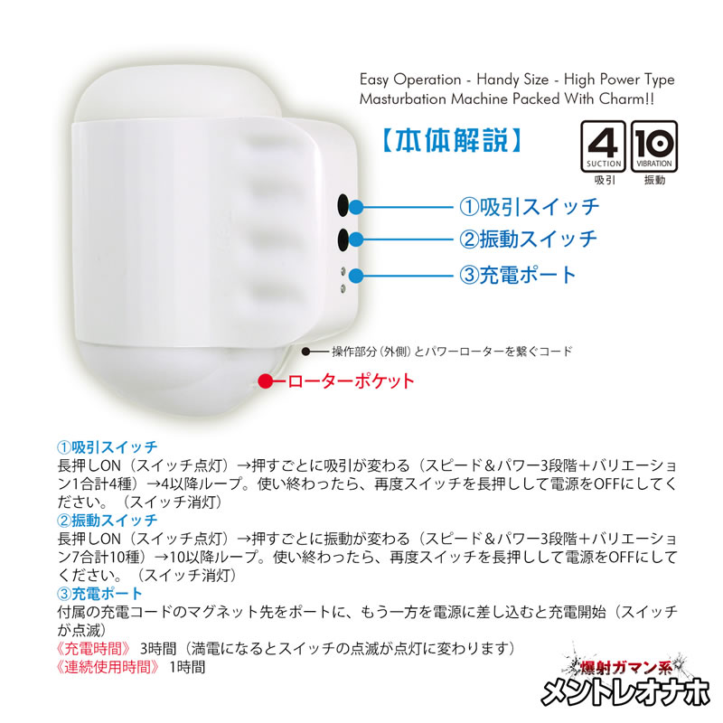 パワフルにしっかりと吸い上げる吸引(計4)とアクティブな重振動(計10)のコンビでペニスから全身まで震わせるハイパワーマシンです。