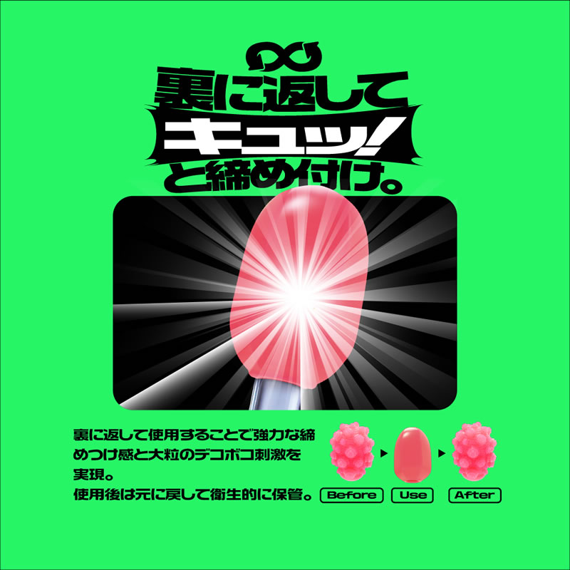 凹凸面を内側に返すことで、大粒の刺激が密集し、キュッと締めつけることで「未確認の触感」を楽しめます。