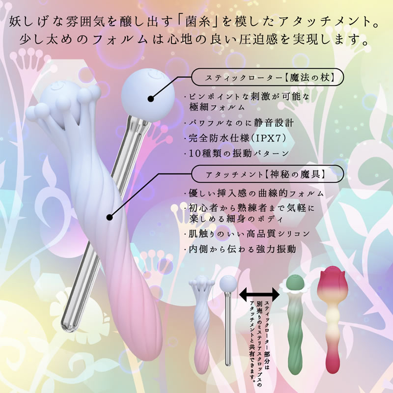 『ミステリアス・クロップス』は着脱可能なアタッチメントとシンプルなスティックローターがセットになったお手軽バイブ。