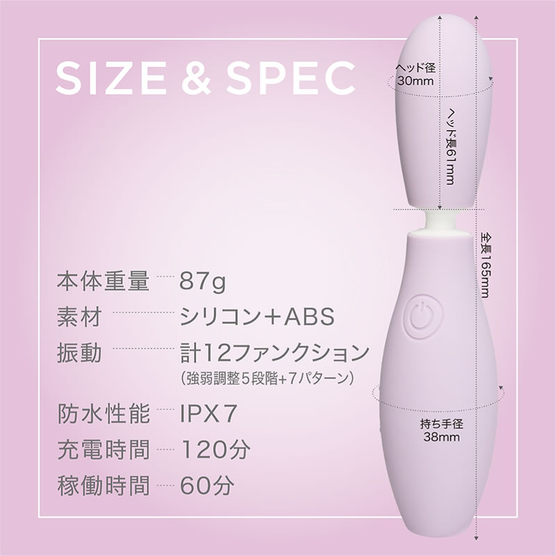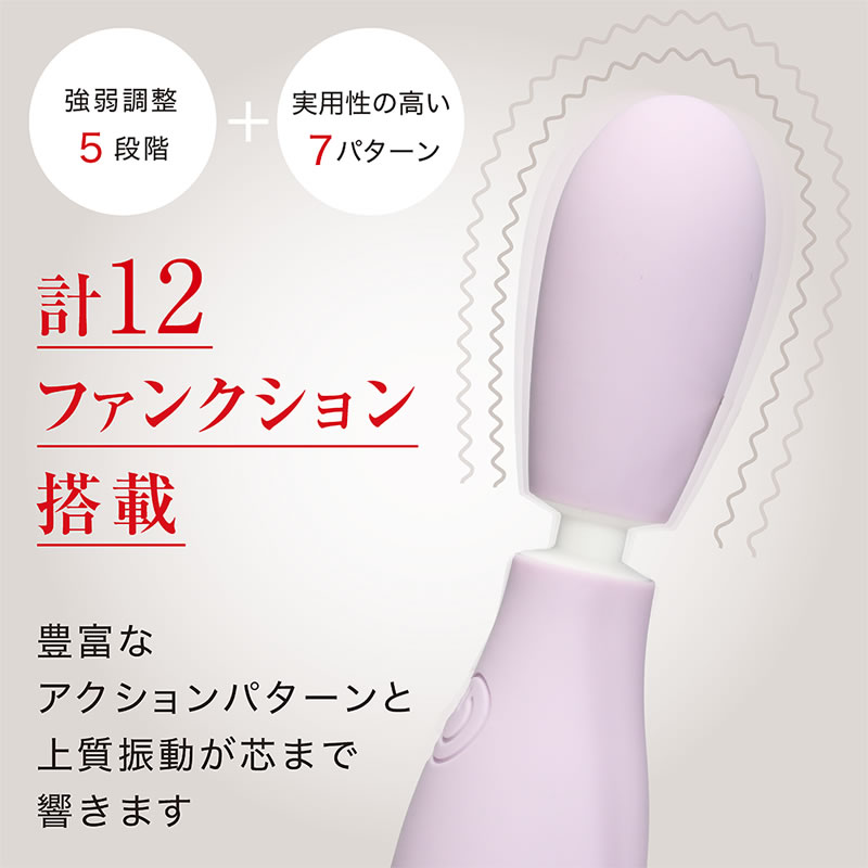 精密に組み合わせたパーツと上質なモーターにより、振動音がわずか30-55dBの静音設計なのに芯まで響くバイブは細かい調節が可能な5段階強弱調整と実用性の高い7パターン振動の計12ファンクション搭載。
