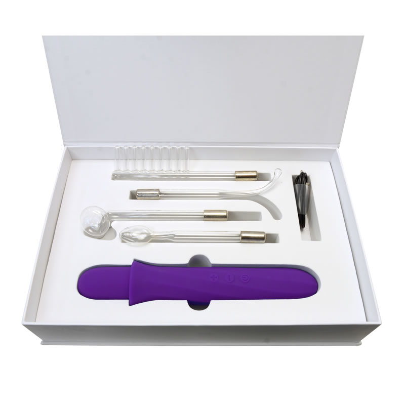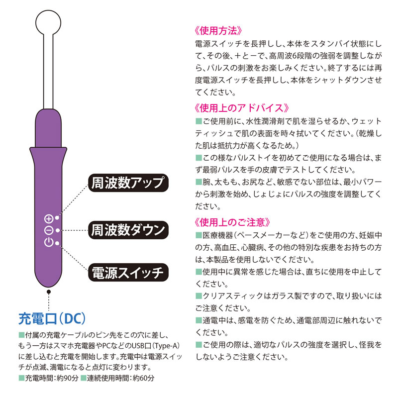 ご使用前に、水性潤滑剤で肌を湿らせるか、ウェットティッシュで肌の表面を時々拭いてください。 (乾燥した肌は抵抗力が高くなるため。) 用意ができたら、クリアスティックを本体に差し込んで、電源スイッチを長押しし、本体をスタンバイ状態にします。その後、+と-で、高周波6段階の強弱を調整しながら、パルスの刺激を操作します。やけどを防ぐため先端を同じ個所に長時間当て続けず、先端をちょんちょんと肌に当てるクイックコンタクト法、先端を肌にあて、スッと撫でるスライディングコンタクト法の併用をおすすめします。