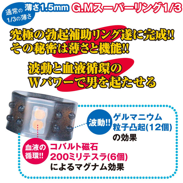 従来のリングの1/3という薄さを実現した、厚さ1.5mmの超薄型シリコンリングに、12個のゲルマニウム粒子突起と200ミリテスラのコバルト磁石6個を装着。