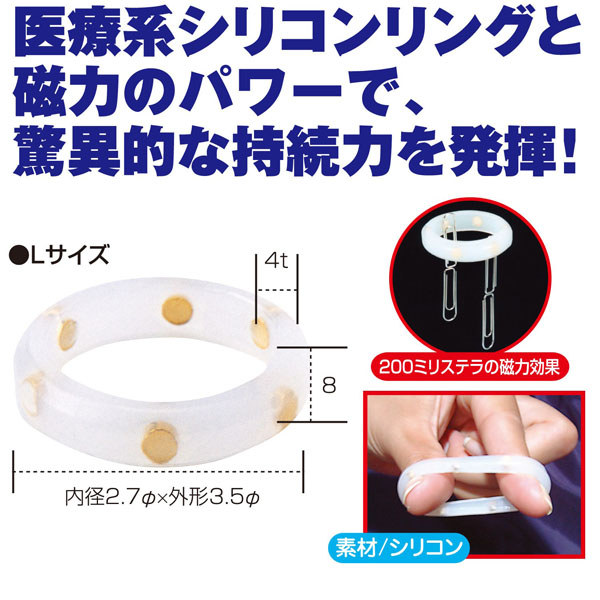 医療系シリコンリングの中に複数のマグネットが納められたリングです。男性自身のくびれと根元に装着すると、薄いシリコンを通して200ミリテスラの磁力が。