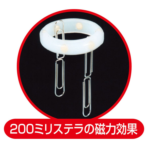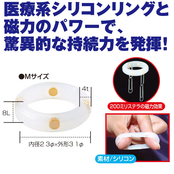 シリコンリングの中に複数のマグネットが納められたリングです。男性自身のくびれと根元に装着する。