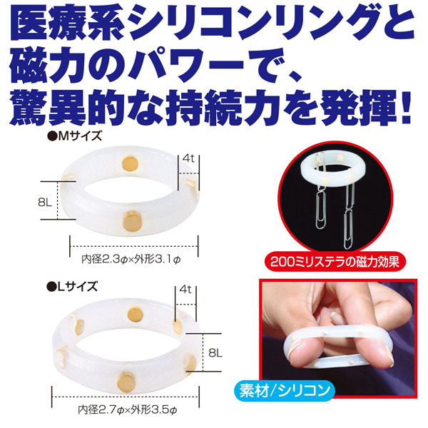医療系シリコンリングの中に複数のマグネットが納められたリングです。男性自身のくびれと根元に装着すると、薄いシリコンを通して200ミリテスラの磁力が。
