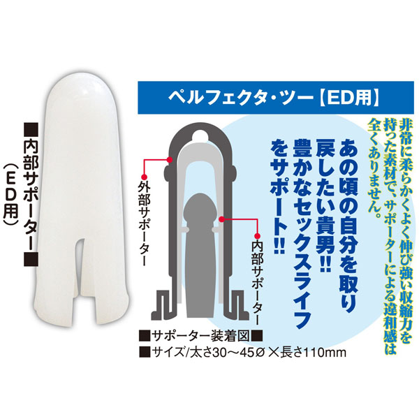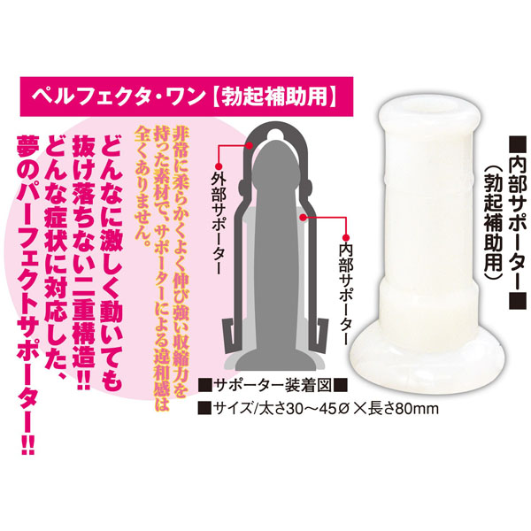 どんなに激しく動いても抜け落ちない二重構造を業界で初めて採用しました。外部サポーターの内側に、用途に合わせて2種類の内部サポーターを使い分けてセットして使用する、画期的な構造が採用されています。内部サポーターは、勃起補助用・ED用のどちらも非常にやわらかく、よく伸びて強い収縮を持ったシリコン素材を使用しており、装着時にも違和感を感じさせません。