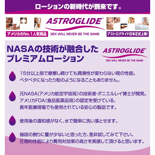 高性能ローションがまだ普及していない日本ですがこのアストログライドであなたのロケットを宇宙へご招待いたします! NASAの最先端技術・ナノテクノロジーが融合したアメリカNo.1ブランドのアストログライドを是非お試し下さい。 今までの常識を覆す、少量で継ぎ足さなくても良い水性ローションがついに日本へ正式上陸です!