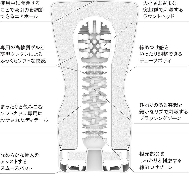 新配合軟質素材と新開発リニアチューブとが織り成すユニゾンが、優しくソフトにあなたを包み込みます。ソフトになったチューブは、揉む、握るなどの刺激を繊細に伝達。
