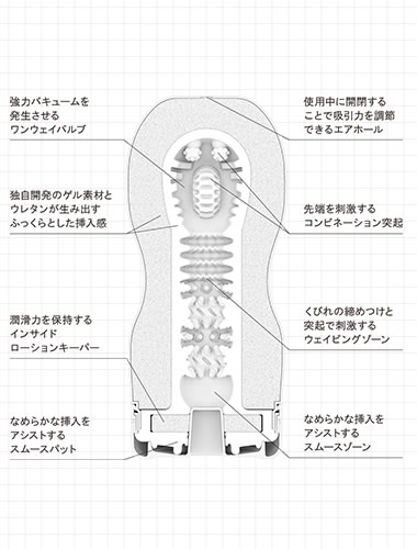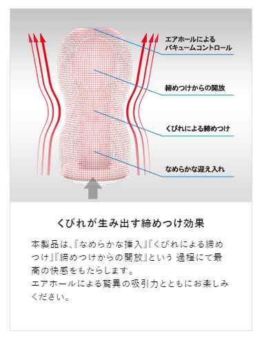 くびれ効果で、DEEPな吸いつき感。特殊なバルブ構造によって、エアホールをふさぎながら引き抜くと、内部が真空状態に近づき、驚異のバキューム効果が発生します。TENGA独自の特徴的なくびれ形状が、抜群の締めつけを生み出し、強力なバキューム効果とともに最高の快感をもたらします。